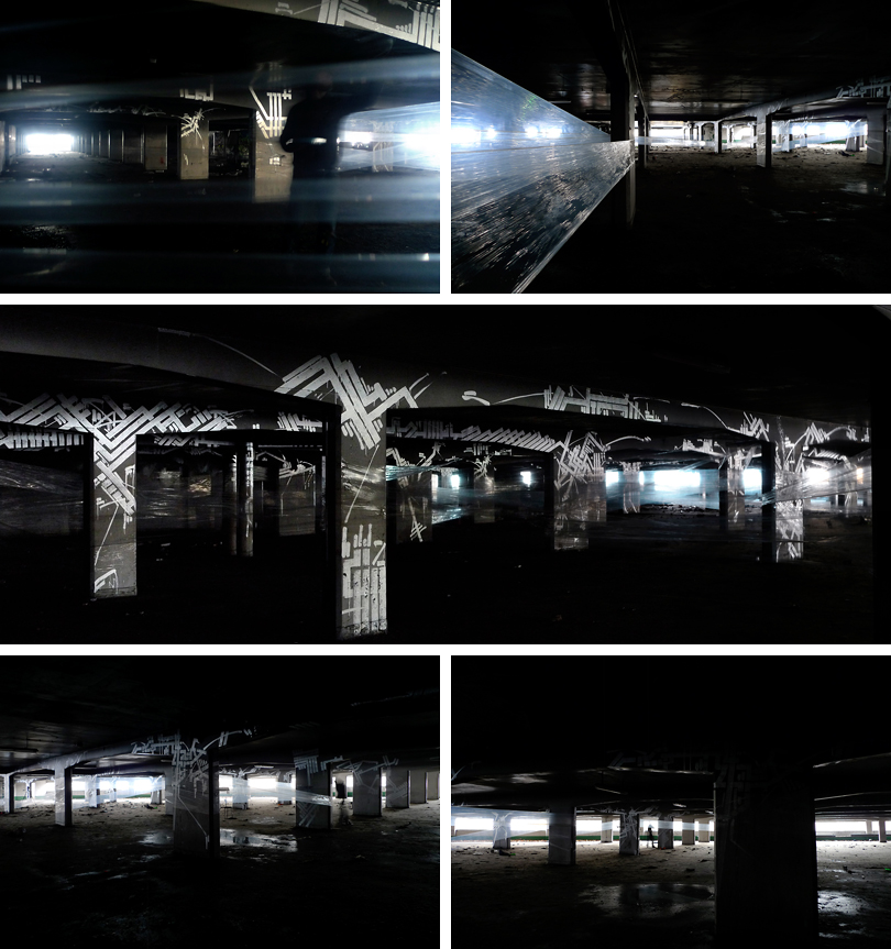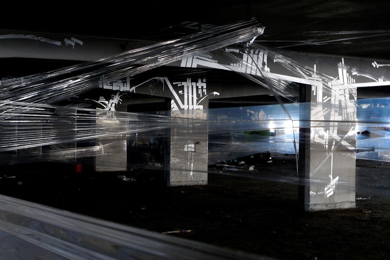 C’est un labyrinthe transparent dans un dédale de piliers, un parking cellophané de voitures disparues, un totem sombre et abstrait…
