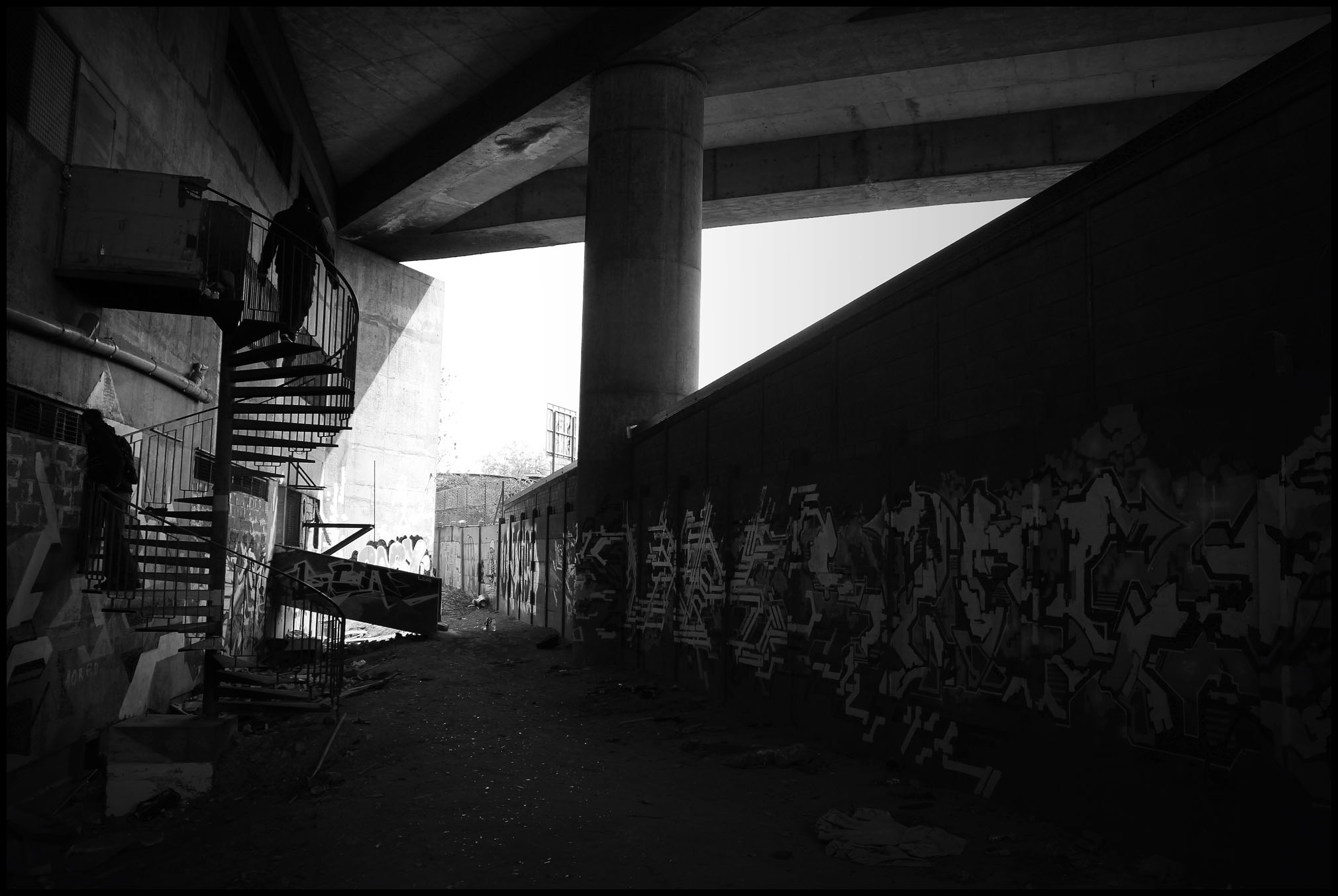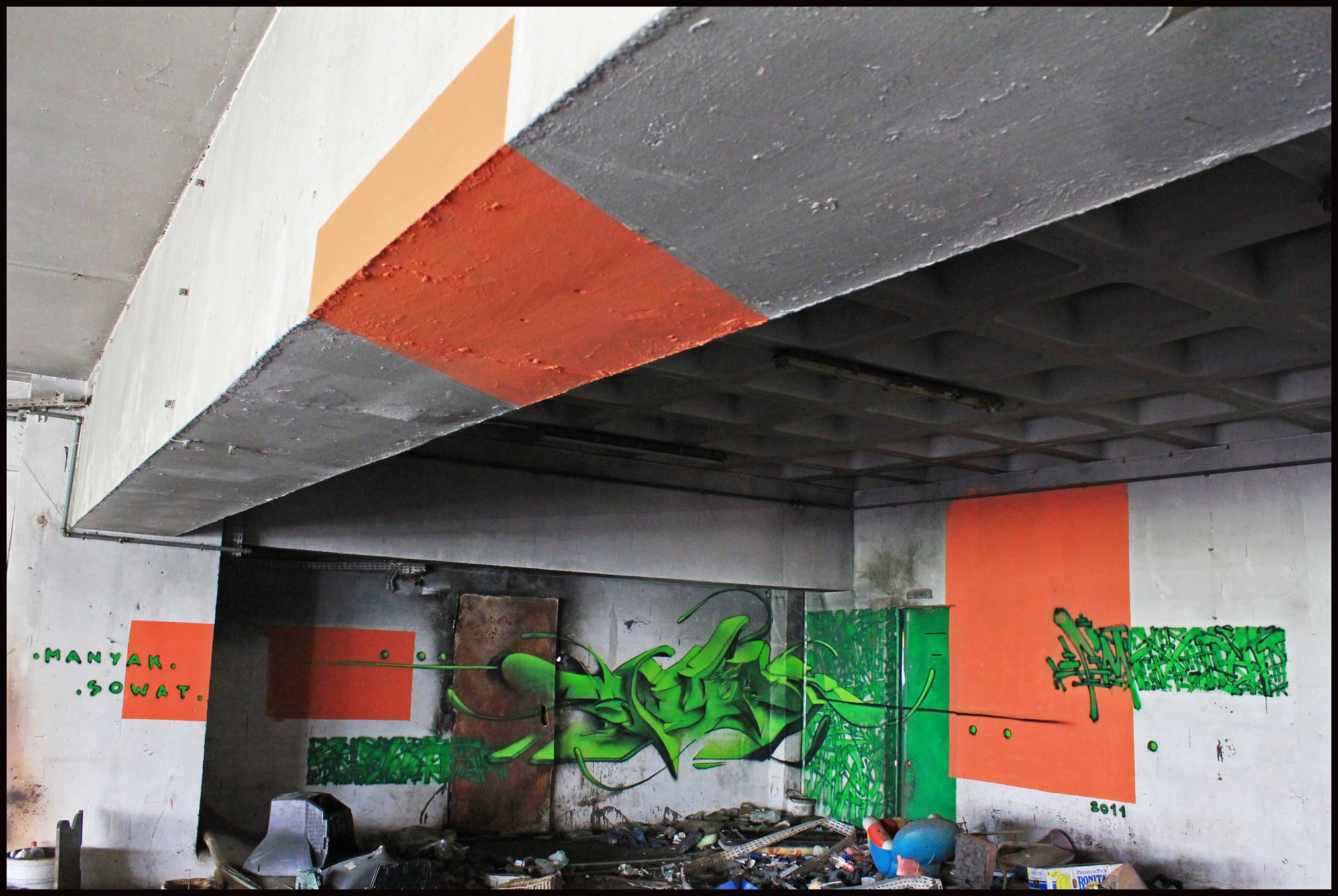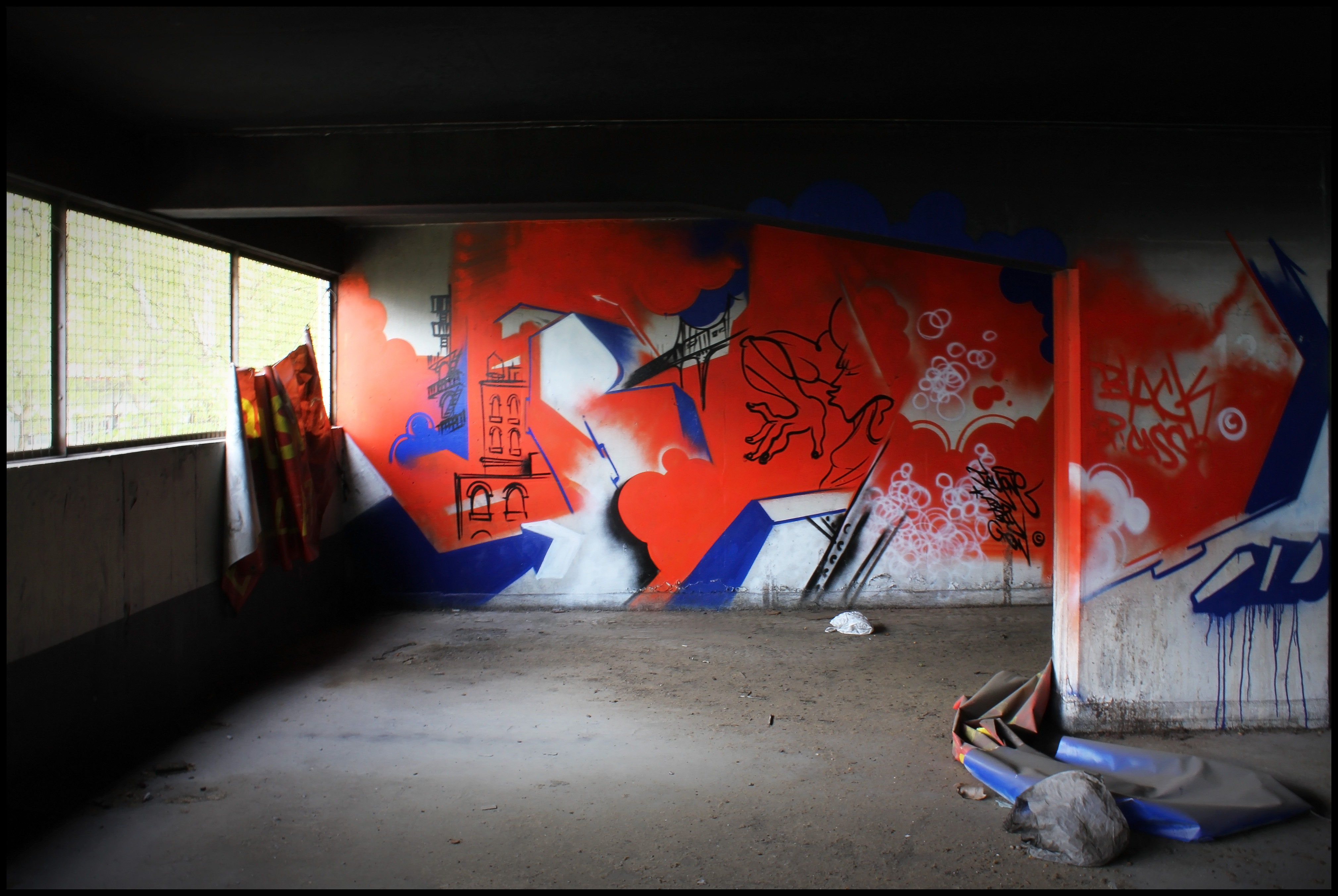 C’était un lundi. Seulement quatre jours après que l’exposition et les images m’aient tapé dans l’oeil, je partis, seul en touriste non avertis, afin de répérer les lieux. Dès mon arrivée sur les lieux, je rencontra deux personnes qui comme moi étaient très intrigué par ce projet. Mais pour pouvoir le voir, il fallait déjà réussir à y rentrer, ce casse tête explique pourquoi le projet a pu se réaliser sans que d’autres graffeurs s’approprient aussi les lieux. Rentré, la lampe de poche s’impose dans des salles ou résonne en continue le passage des voitures sur l’autoroute située au dessus. On a alors du mal à réaliser que se fut un jour un supermarché, chaque étage, des espaces quasi vides regorgent de poussière. Seul trace de vie, les objets des roumains se retrouvent un peu partout dans l’immensité du lieu. Les joués, les doudous, les matelas et autres peuvent laisser imaginer une expulsion rapide et inattendue laissant après consommateurs et vendeurs, roumains et prostituées le lieu à une troisième population, celui des graffeurs. Maintenant, ce sont eux qui ont donné une vie à ce lieu, marriant à travers un projet des plus original des artistes de toutes générations mais avec la même passion. Ils y créent des formes géométtiques, des formes abstraites, des anamorphoses, loins du graffiti pur et dur. Intelligement, ils ont exploités chaque parties du lieu, lui donnant ainsi une ambiance surnaturelle, dans Paris, qui aurai imaginé un lieu pareil ? En décalage avec l’extérieur, ce “mausolée” a vu la volonté devgrafeurs le redessiner, travaillant longuement cet espace stressant, coupé du monde et inaccessible au grand publique. En tant que spectateur, ce fut pour moi le projet de graffiti le plus imposant que je n’ai jamais connu, pour son lieu et la qualitée de ses oeuvres. Surpris car je ne m’atendais pas à ce qu’un tel projet prenne jour à Paris.