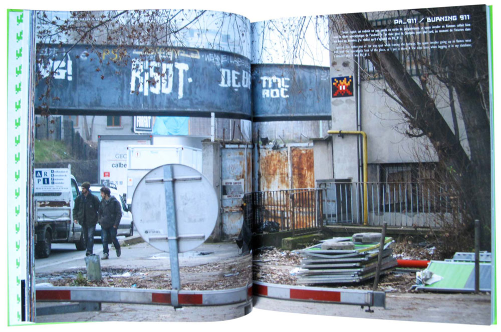 Quinze jours aprés le vernissage de l’exposition ‘Mausolée’, Invader à sorti son nouveau livre, L’invasion de Paris 2.0, dans lequel il documente la suite de sa conquête de Paris en 1400 photos. Pages 58-59, alors qu’il est en train de photographier son 911ème Invader posé sur un mur de la capitale, deux inconnus marchent dans sa direction. En haut à droite de l’image, il a rajouté: